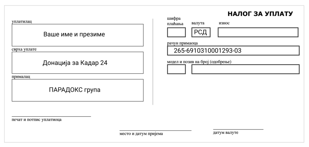 Ако вам се свиђа идеја Студија Кадар 24, можете нам донирати у новцу, роби, или услугама. Ако желите са нама заједно да радите на развијању ове идеје – волонтирајте!